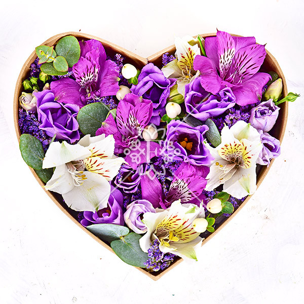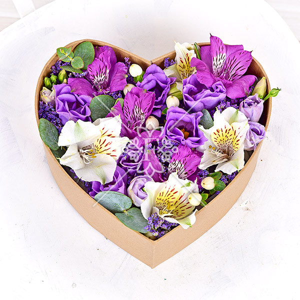 Белая  и фиолетовая альстромерия, лавандовая эустома, лунный  гиперикум, лимониум сдержанно-фиолетового оттенка и декоративная  зелень эвкалипта, оформлена в красивую коробку в форме сердца. Этот прекрасный сувенир поможет  признаться в любви и нежности, сделать комплимент, вручить  желанный подарок.