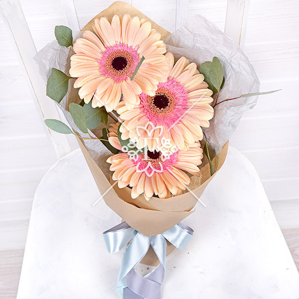 Очаровательные герберы кремово-розового оттенка с зеленью эвкалипта выглядят заманчиво, гармонично и нежно.