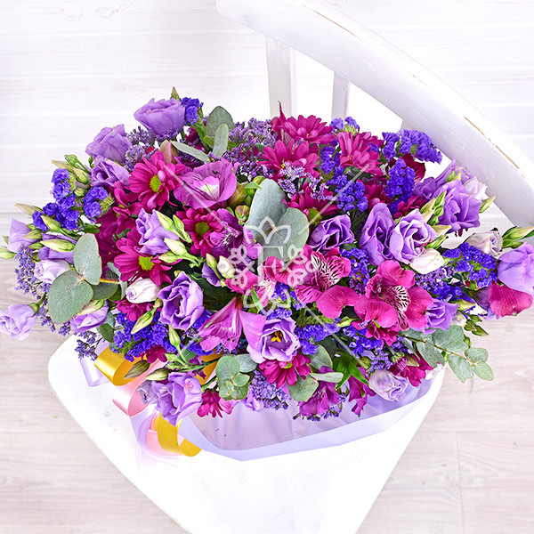В состав этой удивительно-прекрасной флористической легенды вошли фиолетовая эустома и альстромерия, статица цвета индиго, малиново-фиалковая кустовая хризантема, лавандового оттенка лимониум и нежно зеленый эвкалипт.